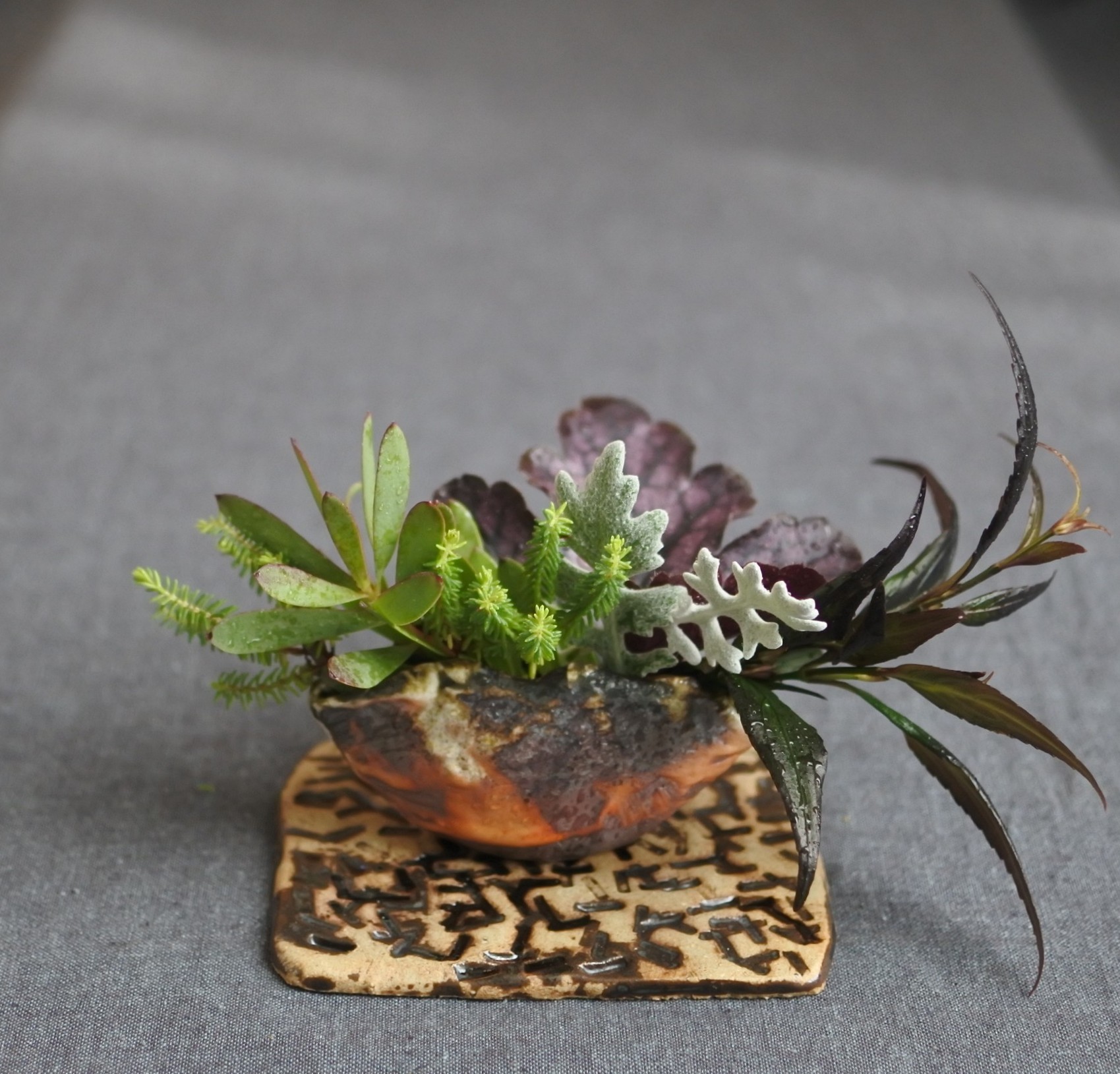 自然釉に黒ビオラ