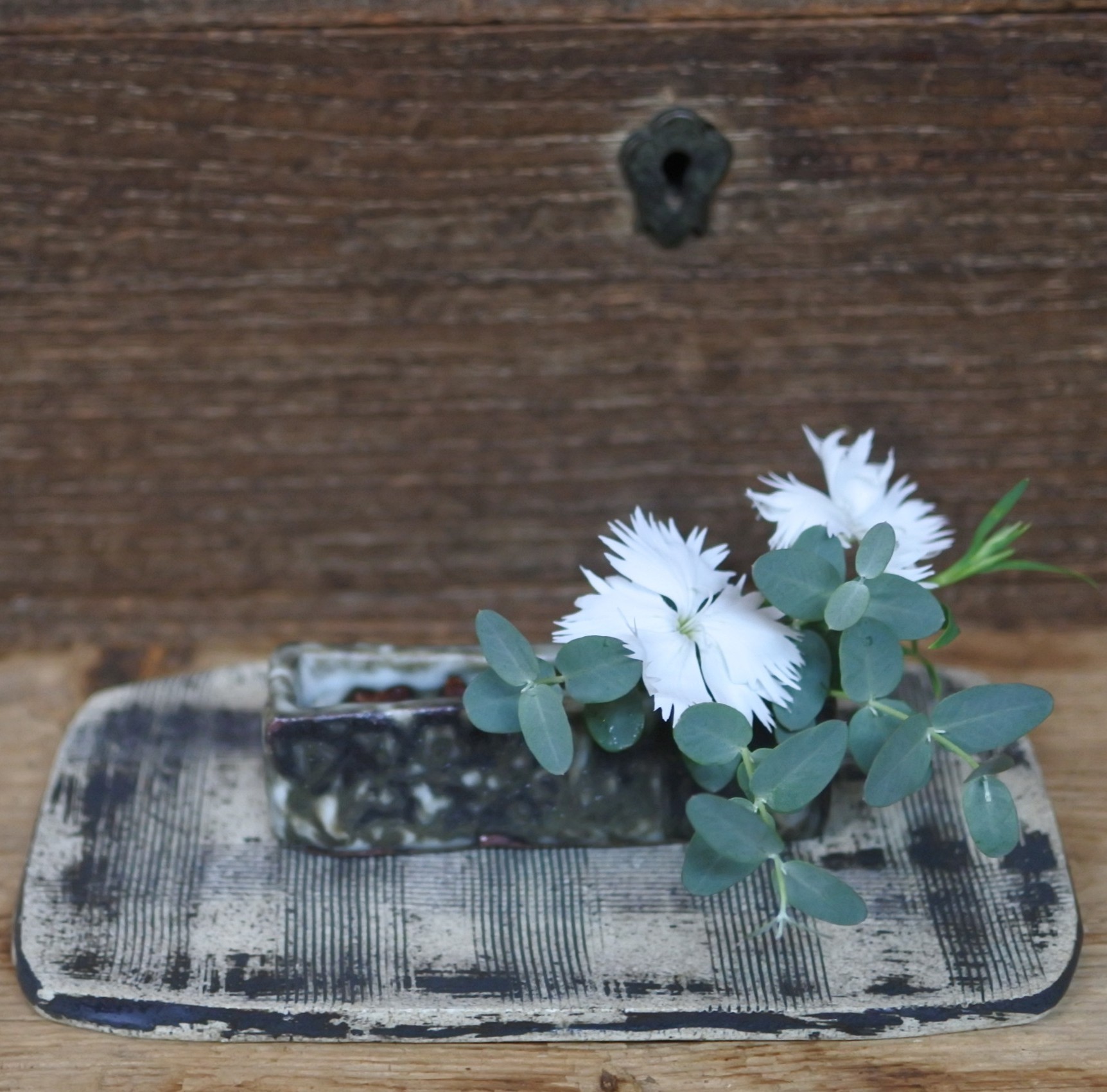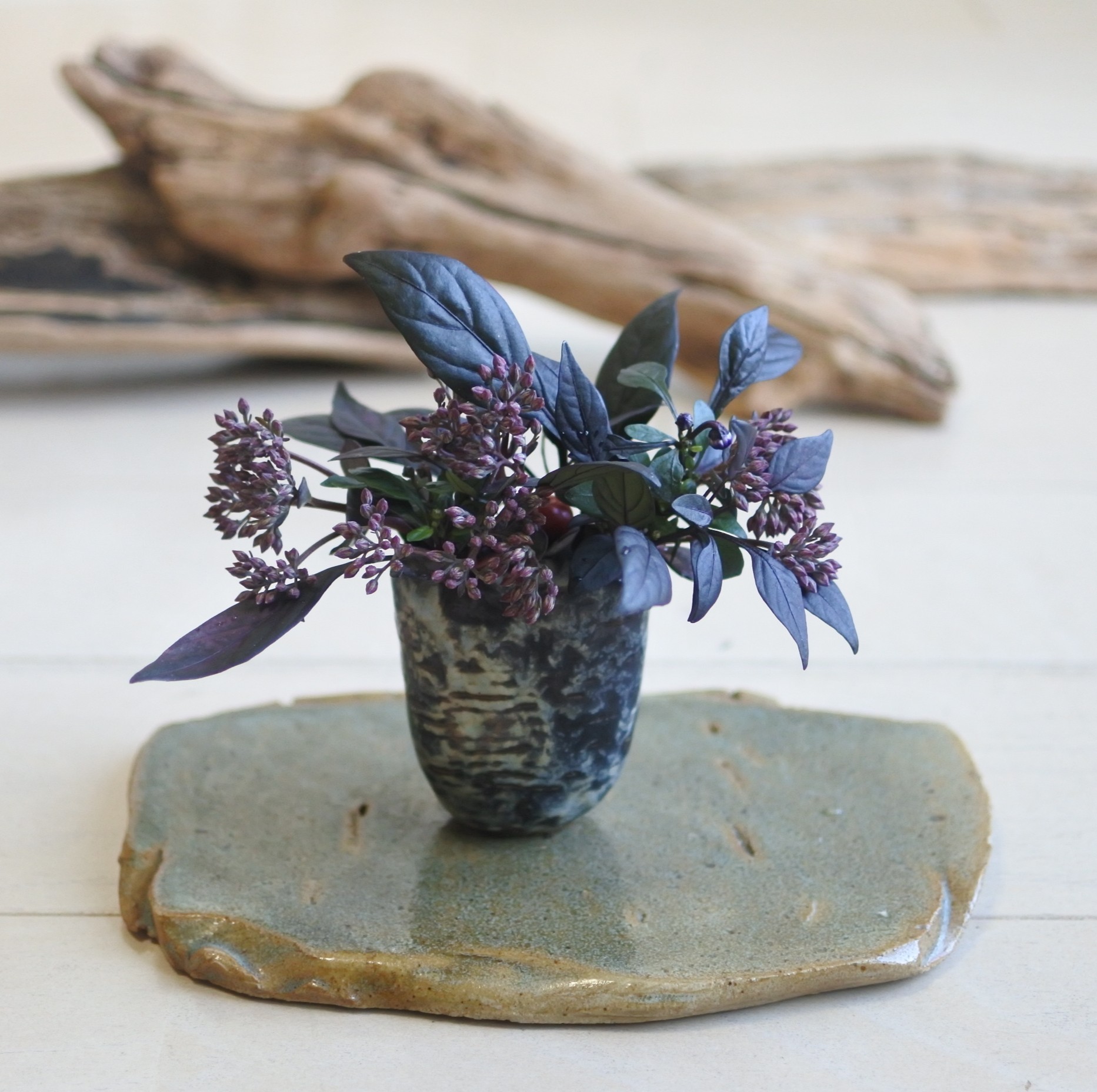 自然釉に黒ビオラ